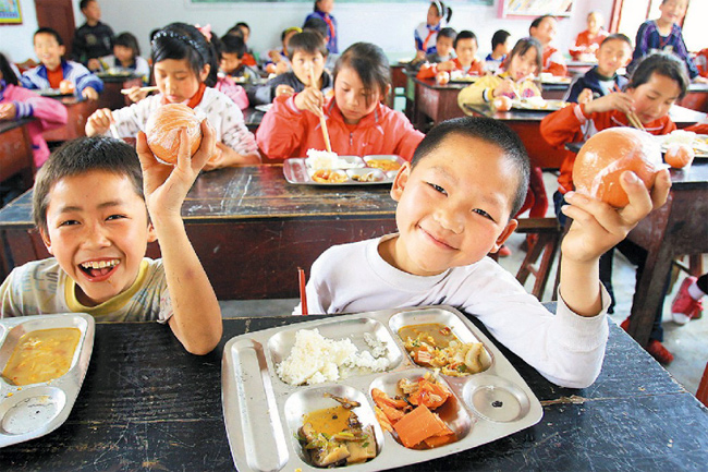 4月12日中午,贵州省麻江县学生午餐时,每人分到一个脐橙。麻江县各学校为保证学生用餐安全卫生,营养可口,严格执行物品采购制度,实行食堂兼职领导、食堂管理人员、采购员三人到场的签单制,把好食品原料关。(中国教育报记者 张学军摄)